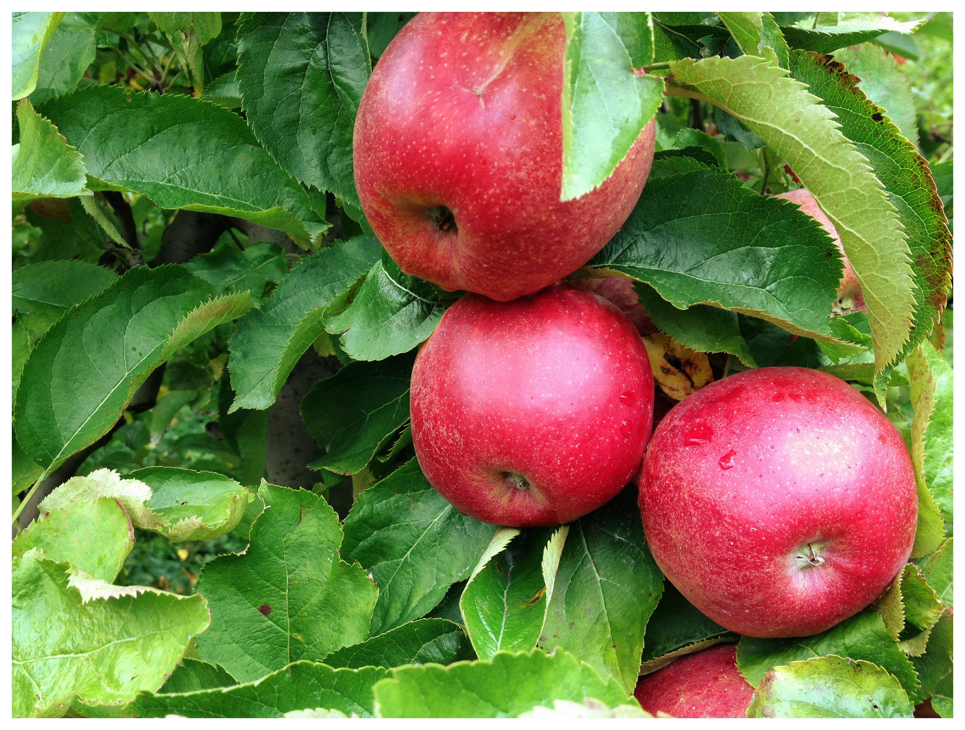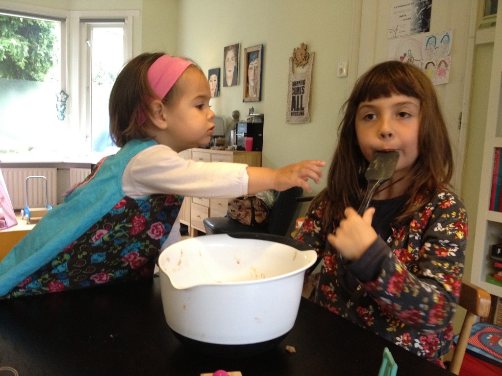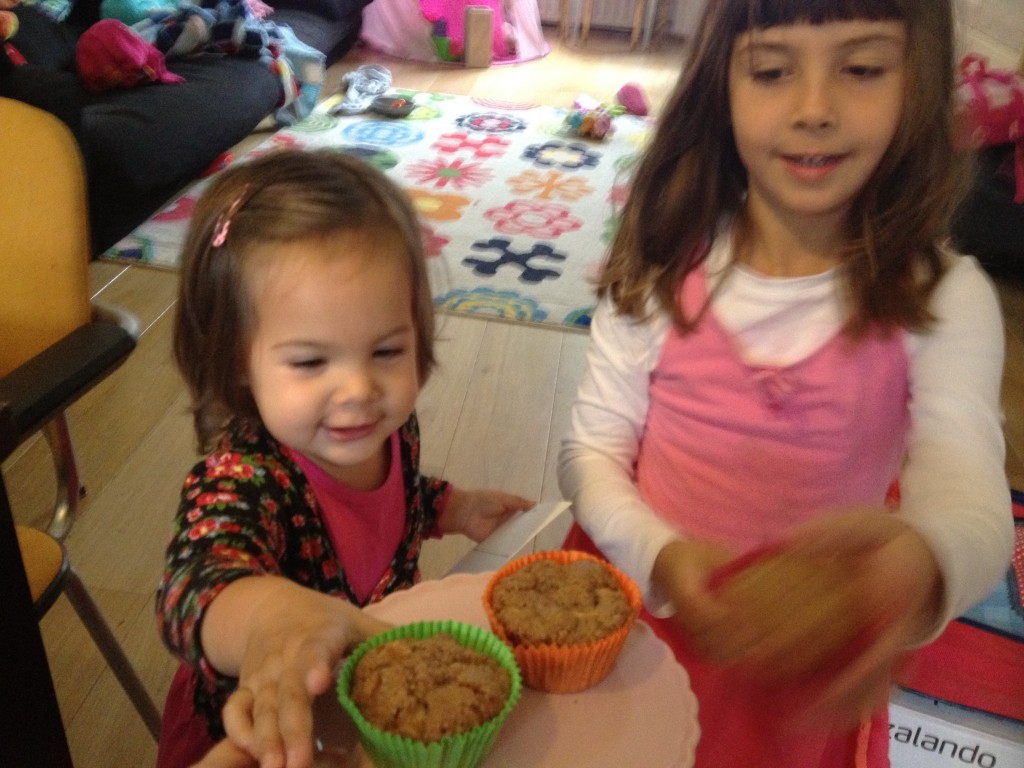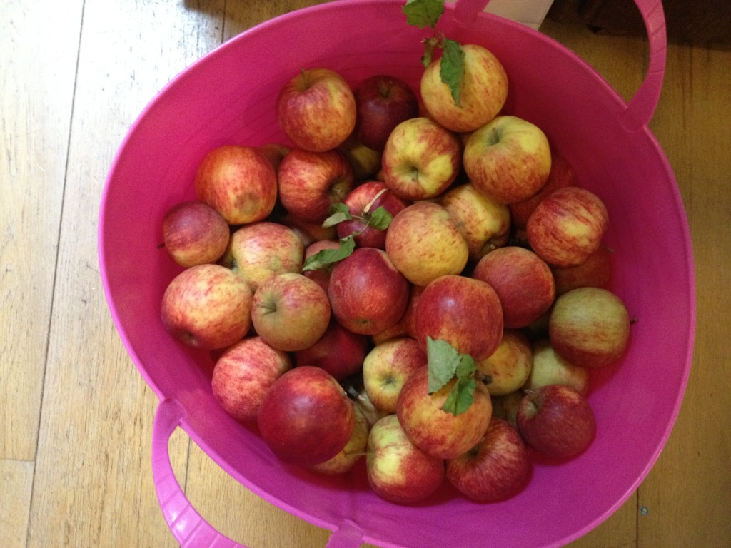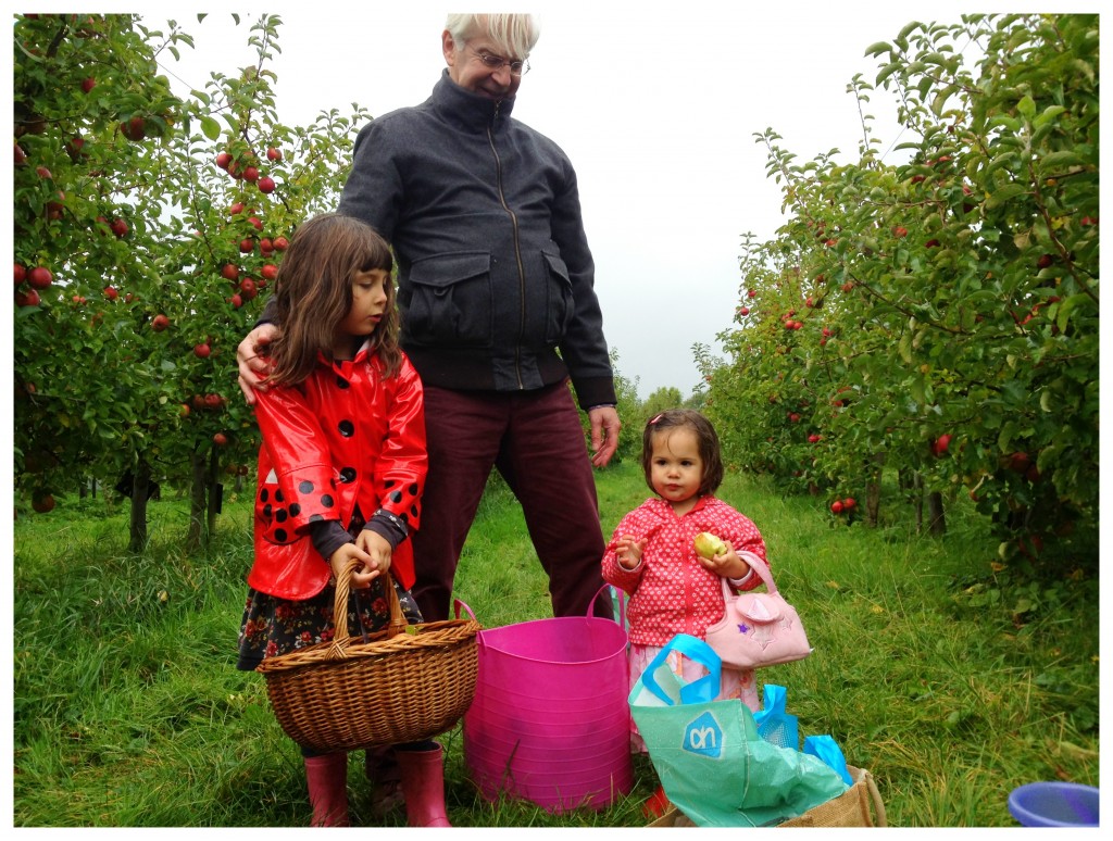 Eindelijk, de adoptieboom is leeggeplukt en in onze woonkamer staat nu een grote, roze wasmand vol Jonagored appels. Heel fris, zoet en met een sappige bite. Jaja, wij zijn erg blij dat juist deze appelsoort de boom van de Missus is, want je kan heerlijk bakken met de Jonagored maar uit het vuistje is ze ook niet te versmaden. Het plukken was dit jaar een stuk avontuurlijker dan de voorgaande jaren. Niet alleen zat er een ‘reusachtige’ spin (ongeveer 0,5 cm2) in de boom, waardoor de Missus steeds terug het pad op werd gejaagd, ook de Kabouter had veel eigen plannen die ze niet altijd uit kon leggen (‘globbe glebbe ettsjjeee?’) en die daarom (en om praktische redenen) ook niet altijd uitvoerbaar bleken. Toen de glijbaan op de Olmenhorst ook nog te nat bleek om goed naar beneden te komen, ontstak dit prachtige, kleine wezentje in een woedeaanval van ongeveer een uur. Arme schat. Gelukkig was opa mee om de Missus gezelschap te houden tijdens het chocomelk drinken en Kabouter ontwijken.