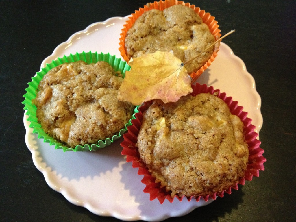 Eenmaal thuis hebben we appelmoes gemaakt, appelflapjes en ook deze heerlijke appelmuffins. Dit recept is voor 10 tot 12 muffins.