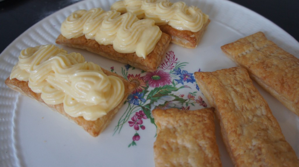 Verwarm de oven voor op 200 C. Snij de bladerdeegplakjes doormidden en prik ze in met een vork. Hoe meer je prikt, hoe platter het deeg blijft tijdens het bakken. Leg de plakjes deeg op de bakplaat en bak in 12-15 minuten goudbruin en gaar. Laat afkoelen op een bord of rooster. Verwarm de melk voor de banketbakkersroom tot tegen het kookpunt. Roer intussen in de mengkom de eierdooiers, suiker, vanillesuiker en het bloem goed door elkaar. Als de melk bijna kookt, giet je het langzaam! bij het eimengsel terwijl je heel! goed klopt. Giet dit mengsel terug in de steelpan en verwarm op laag vuur onder continue kloppen nog een minuut of 5 tot je een dikke room hebt. Spoel de mengkom even om en giet de room terug in de kom. Dek de room helemaal toe met een stuk huishoudfolie om een vel te voorkomen. Laat afkoelen.