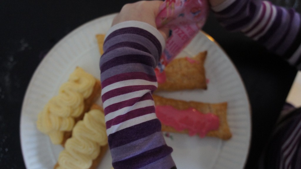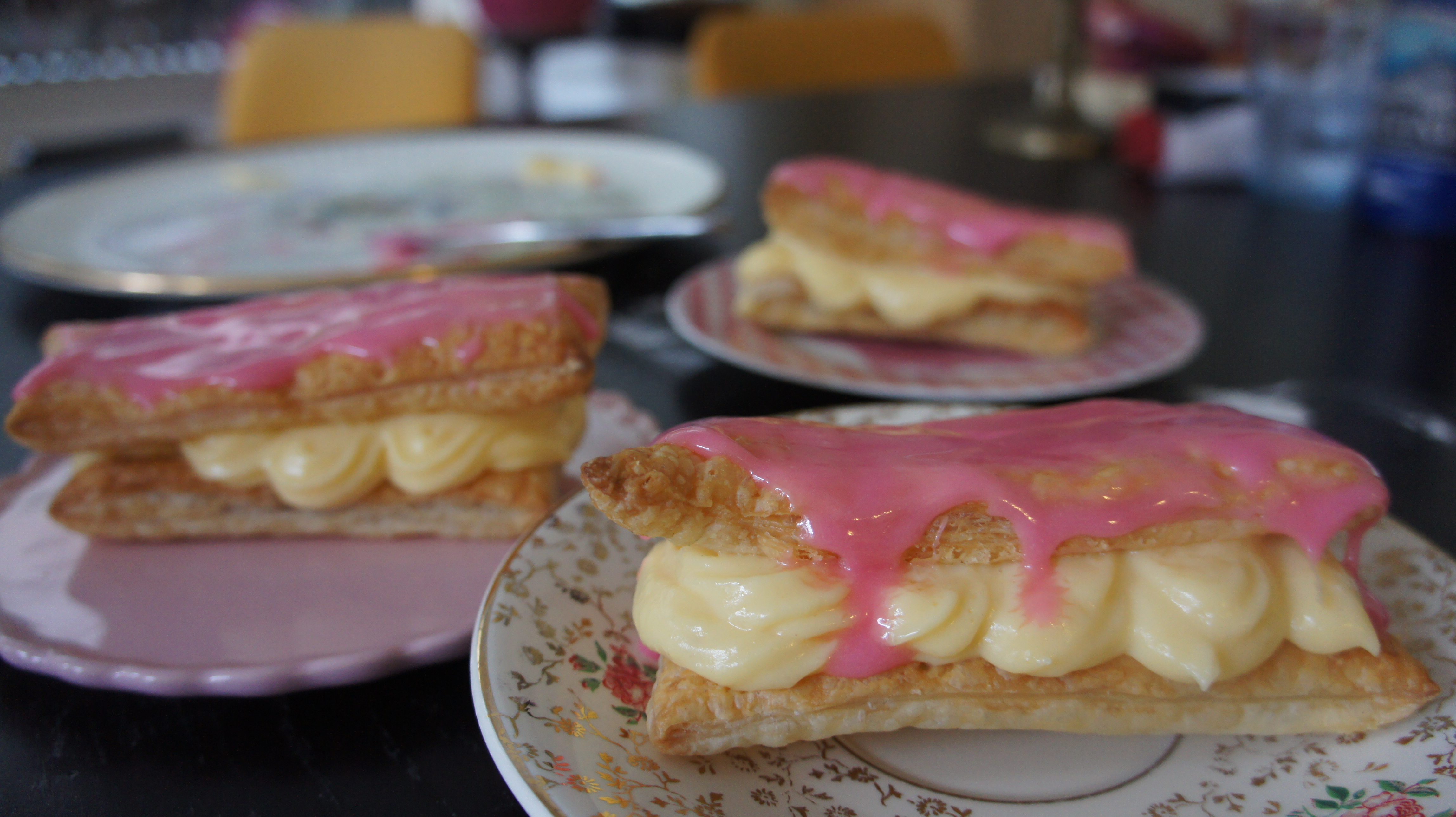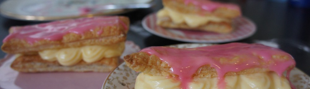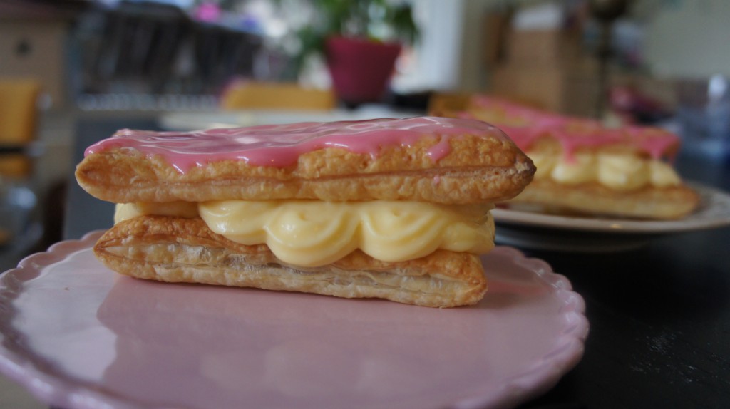 Tompoes (of pouce), Neerlands hoop in bange dagen. Een onderscheidend lekker gebakje. Dat soort dingen. De Missus is er dol op, maar ze heeft zo’n luie Mama. Zo ééntje die alleen als het echt niet anders kan de deur uit gaat om dingen te kopen (lang leve online shoppen) en daarom waren wij genoodzaakt om onze tompoescravings te stillen door het zelf te maken want resulteerde in de lekkerste én meest charmante tompoezen die ik ooit heb gegeten. We hadden een zakje roze glitter Lilifeeglazuur, dat was een goed begin. Verder bestaat een tompoes uit bladerdeeg <onze vriezer heeft een vaste voorraad van deze gerechtensaver liggen> en banketbakkersroom. Dat kan je zo zelf maken, eitje. Echt. Dit recept is voor 3 royaal belegde tompoezen, maar ik denk dat deze hoeveelheid banketbakkersroom voor 4 ook wel lukt. Je kan makkelijk zelf glazuur maken, ik zet het recept erbij. En slagroom als vulling is ook een optie natuurlijk.