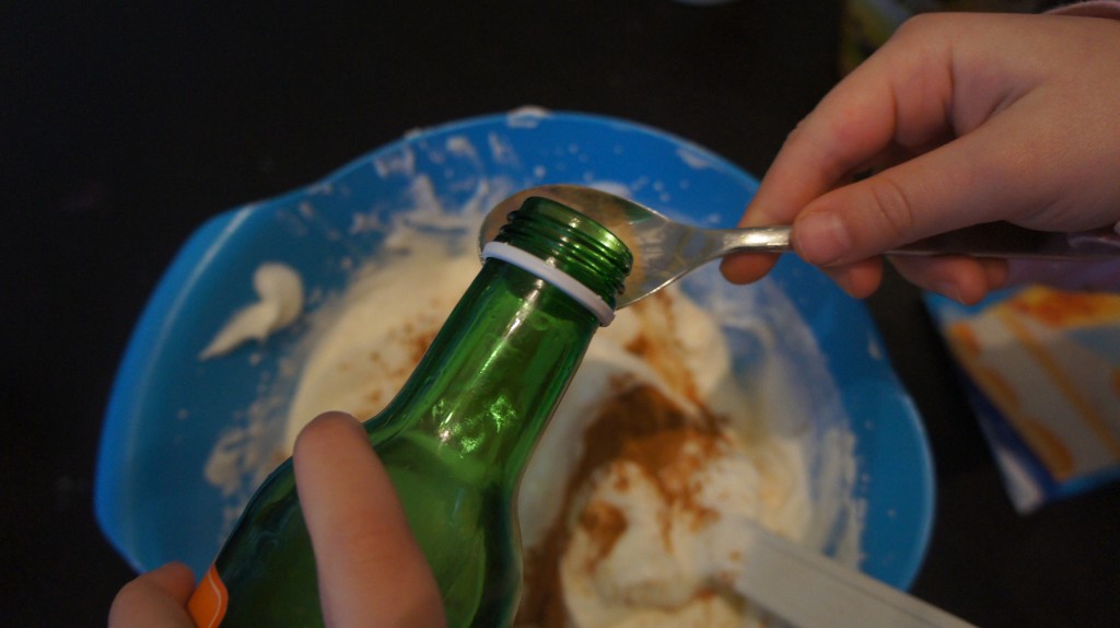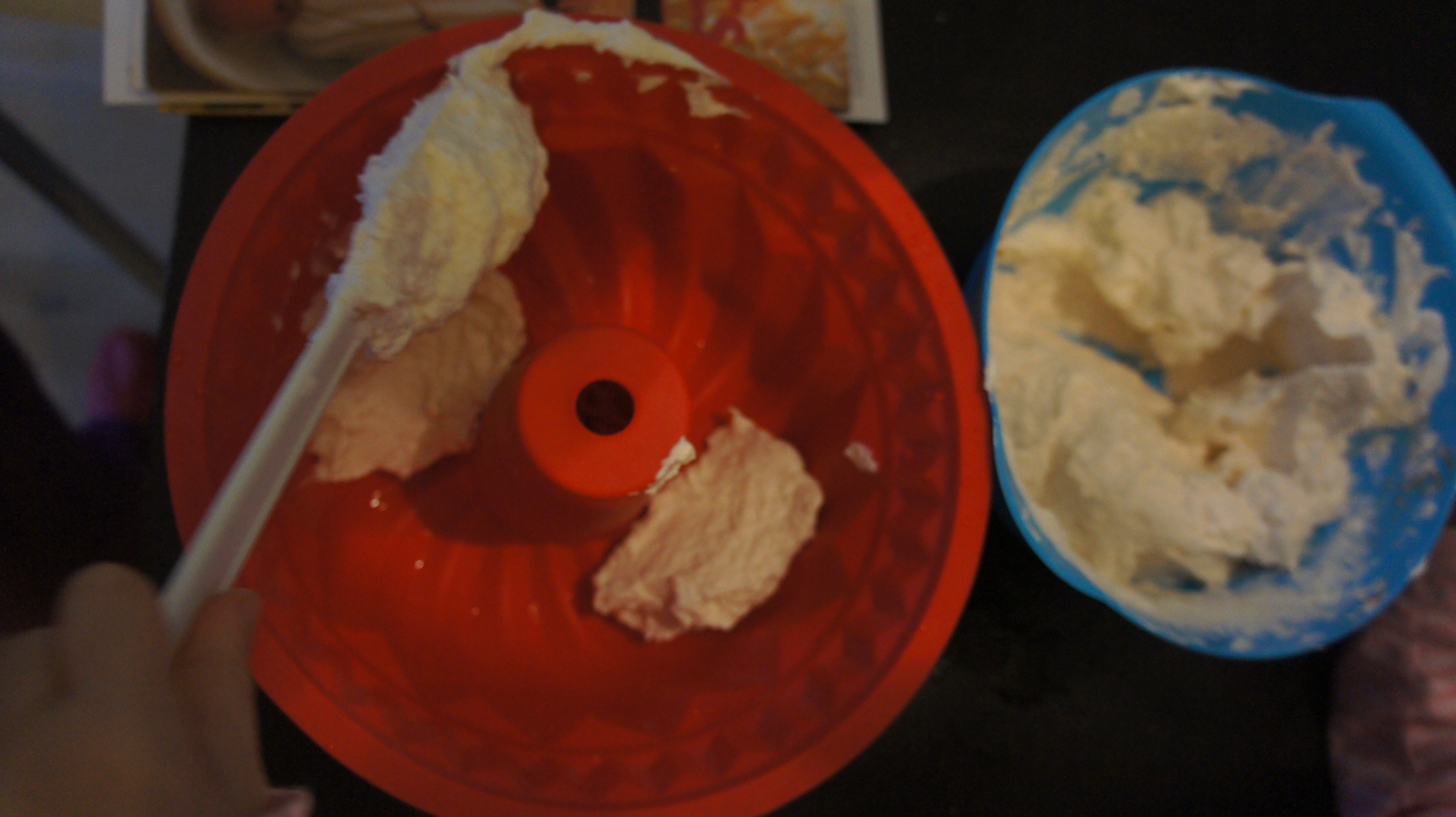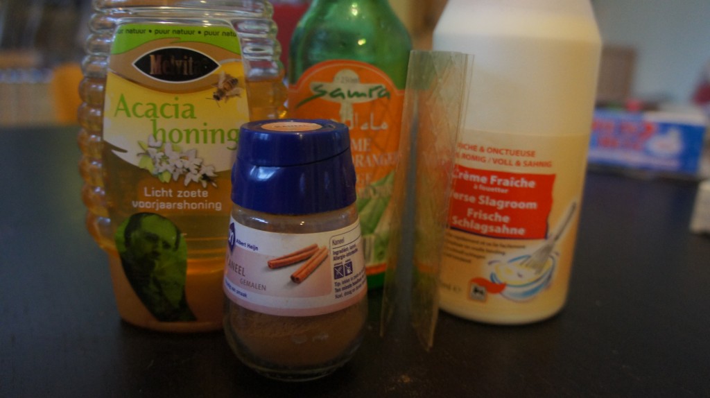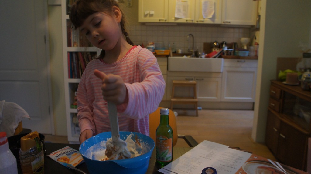 Week de gelatine 10 minuten in een beetje water in het kommetje. Klop de slagroom stijf met de mixer en vouw er voorzichting met de spatel de honing, kaneel en oranjebloesemwater door. Heb je dat laatste niet, doe dan een half lepeltje kaneel extra erbij. Als de gelatine is geweekt, knijp deze dan uit en verwarm op zacht vuur in het steelpannetje tot het helemaal gesmolten is en goed heet. Meng de gelatine snel door het slagroommengsel met een garde. Als je dit niet snel genoeg doet, koelt de gelatine al af voordat je het goed kan mengen en krijg je klontjes in je pudding. Dus, de volgende keer doe ik dit stukje van het bereiden toch maar zelf, want de Missus was nu zo met haar hoofd bij de heerlijke slagroom op haar handjes dat snel mengen niet echt aan de orde was. Spoel de puddingvorm om met koud water en vul met de slagroommix.