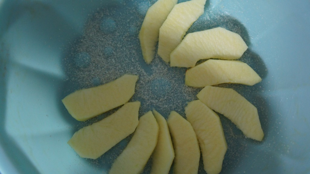 Vet de bakvorm in. Als je een springvorm gebruikt, bekleed de bodem dan met bakpapier. Strooi een beetje suiker over de bodem van de siliconenvorm en leg een rondje appelpartjes erop. Dit wordt straks de bovenkant van de taart, als je een springvorm gebruikt doe je deze stap pas als je taart al in de vorm zit, en dan omgekeerd: dus eerst een mooi rondje appelpartjes en dan wat suiker strooien.