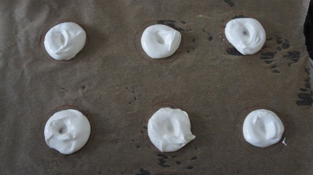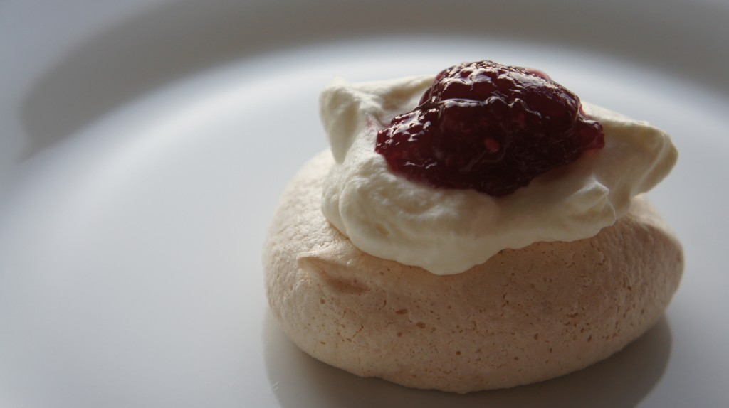 De inspiratie voor dit recept vonden wij natuurlijk weer bij Nigella, haar ‘mini-pavlova’s’ zijn prachtig en heerlijk maar vol met zomerfruit en dat hadden we niet in huis. Het is november, dus granaatappelpitjes zou wel weer perfect zijn maar dat hadden we ook niet. Een lepel jam bood uitkomst, zo is er ook weer sneller een potje leeg voor onze volgende jam-maak-ronde. Ik heb de ingrediënten weer afgemeten met de lepel-maatjes. Met één eiwit maakten wij zes meringues.