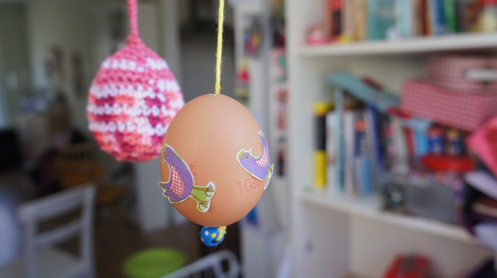 *Ei leegblazen om te versieren: prik aan beide lange kanten een gaatje met een  punaise. Maak het gaatje iets groter en blaas door de bovenkant de inhoud van het ei in een bakje. Als het niet meer klotst als je schudt is alle ei eruit en kan je wat water er in laten lopen om schoon te spoelen. Blaas dit er ook weer uit en laat het ei drogen. Haal een droodje door het ei met een lange naald en knoop een kraal aan het einde zodat je het ei op kan hangen.