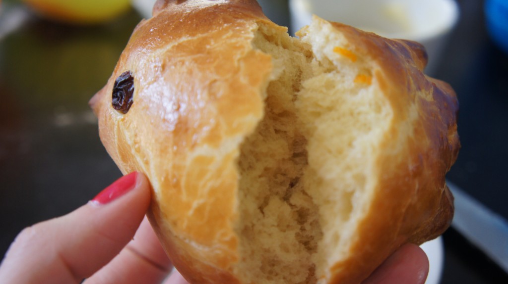 Verwarm de oven voor op 220 C. Klop het tweede eitje in een kommetje los en bestrijk de broodjes met het ei. Druk een rozijntje of wat hagelslag als ogen of neusje in het deeg -met wat geknutsel heb je een leuk Nijntjes neus/mondje. Bak de broodjes midden in de oven in 15 minuten goudbruin en gaar. De broodjes zijn heerlijk luchtig en hebben een zweempje zoet, met name door de sinaasappelschil. Perfect om recht uit de oven met wat boter op te eten.