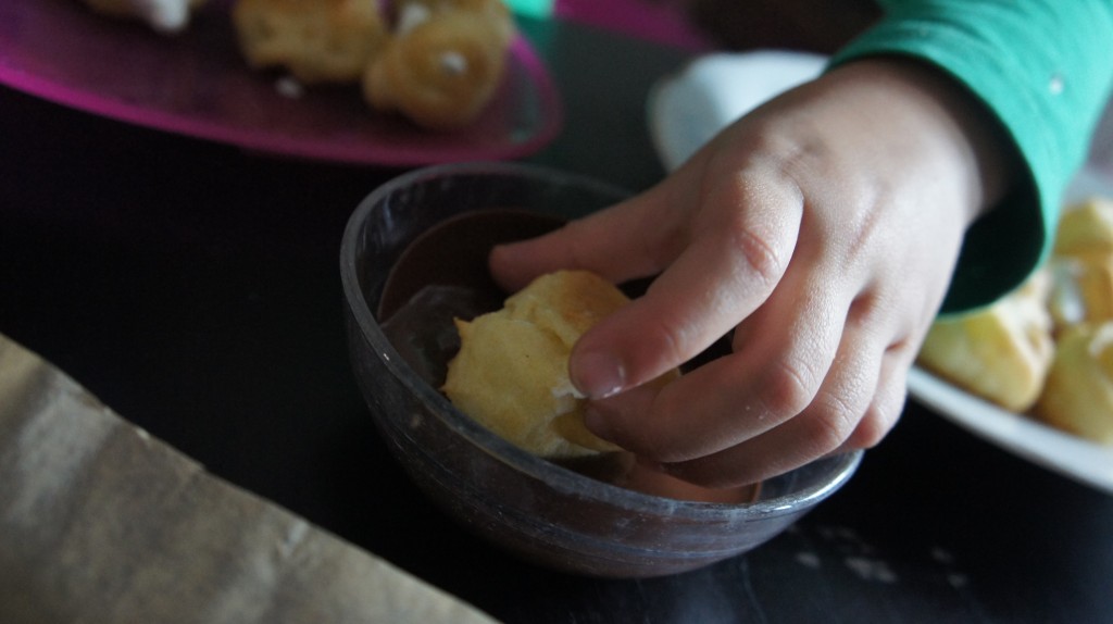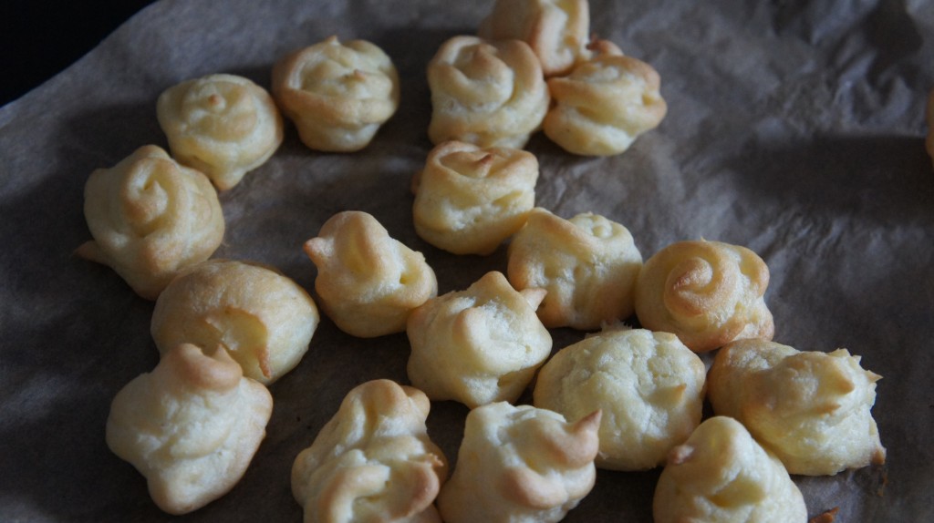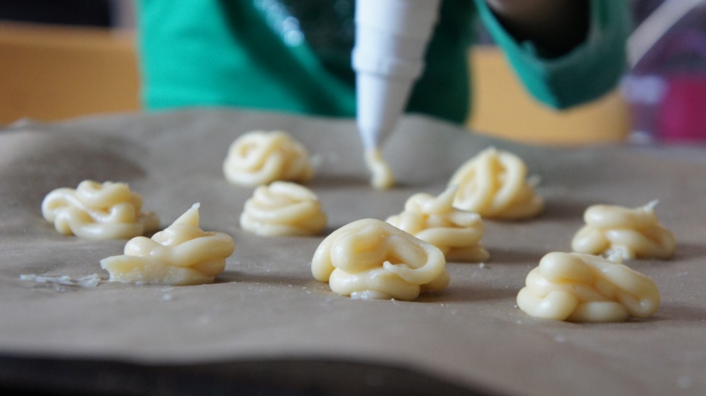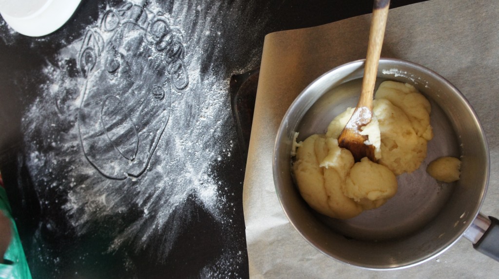 Ooh maar dat is eigenlijk helemaal niet waar ik over wilde schrijven. We hebben namelijk soesjes gebakken, een universeel recept en dus ook te vinden in ‘Hoe word ik een goddelijke huisvrouw?’ Wij hebben de hoeveelheden gehalveerd en hadden 25 kleine soesjes. Het is zooo makkelijk, soesjes bakken. En zo leuk om te doen en lekker kliederig, super geschikt voor kinderkookkunsten.