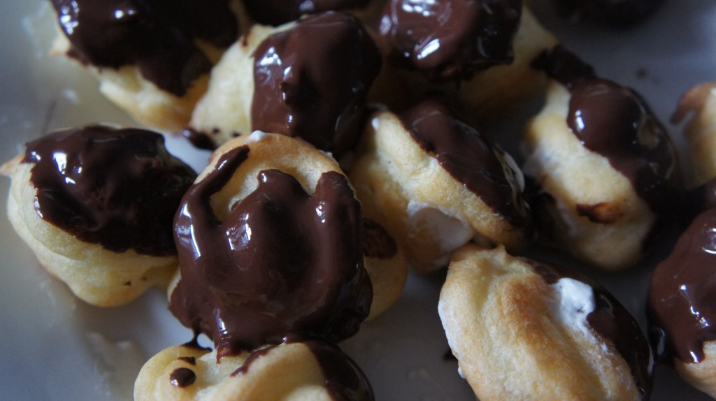 De Missus heeft enorm veel plezier gehad met dit recept, al die hoopjes deeg in gekke vormen, slagroom overal, gesmolten chocolade… alles werd met veel plezier geproefd, getest en gemaakt. Het resultaat was nogal eigenaardig om te zien misschien, maar daarom niet minder lekker. En de soesjes bleken zelfs houdbaar: in een plastic bakje-met-deksel waren ze 24 koelkast uren later nog net zo lekker.