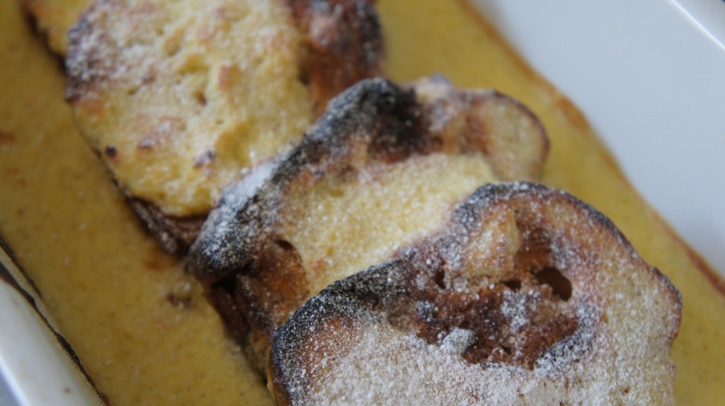 Verwarm de grill (liefst in combinatie met hete lucht) van de oven voor op 180 C. Snij het suikerbrood in plakken en besmeer dik met roomboter. Leg de boterhammen op de met bakpapier beklede bakplaat en schuif onder de grill, niet te dicht bij want dan kan het papier vlam vatten. Laat het brood in ongeveer 8 minuten lekker bruin en knapperig worden en haal daarna uit de oven. Snij de plakken eventueel diagonaal in tweeën en leg ze dakpansgewijs in de beboterde ovenschaal. Zet de melk op in de steelpan met de suiker en het vanillestokje. Dat stokje schraap je eerst leeg door het overlangs met een mesje in te kepen en daarna de vanillemerg eruit te schrapen. Doe zowel de merg als het stokje in de melk en breng aan de kook. Klop ondertussen de eieren los. De Missus wilde dit graag doen, net als alles wat met de boter te maken had. De truc om dit zonder al te veel geknoei voor elkaar te krijgen is om je kleine chef voorzichtig te verzoeken het kommetje met één hand vast te houden, en met de andere hand te kloppen. De foto helpt niet natuurlijk, maar je begrijpt wel wat ik bedoel.