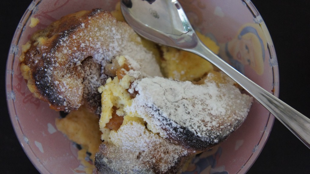 Als de melk kookt, en de eieren mooi egaal geklopt zijn, haal je de melk van het vuur en klop je de eieren er doorheen. Niet verder verwarmen: dan gaat het schiften en krijg je roerei met suiker ipv romige custard. Als je een lekker mengsel hebt haal je het vanillestokje eruit en giet je de custard over het brood. Zet de schaal weer onder de grill en bak voor 15-20 minuten tot het brood weer een mooi krokant laagje heeft. In het recept van Home Made zetten ze de schaal in een grotere schaal met water, zodat je in de oven au bain marie bakt, zeg maar. Ik heb dat niet gedaan, en het resultaat was echt prima. Bestrooi met poedersuiker vlak voor het serveren. Heerlijk met vanille-ijs, denk ik. Maar dat hadden we niet, dus gewoon zo gegeten en nog steeds heerlijk.