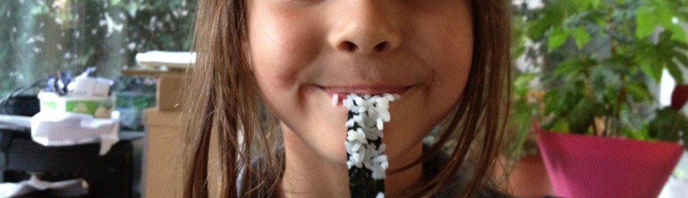 Jaaa sushi, geen paniek, het is helemaal niet zo exotisch hoor, gewoon rijst-met-vis-en/of-groenten. In een rolletje met wat zeewier er omheen. De Missus is dol op sushi, de Kabouter wat minder maar die vind het dan wel weer heel leuk om een mooi druipkasteel van rijst en sojasaus te maken. We hebben gekozen voor de ingrediënten van een California roll: avocado, surimi en komkommer, maar hem dan ‘gewoon’ gerold met zeewier er omheen en zonder viseitjes. De Missus vindt de kleine tobiko heerlijk, daar niet van, maar we konden het niet vinden bij de Chinese Boot of Albert Heijn. Bovendien: ik vind het rollen met zeewier al ingewikkeld genoeg, zonder kan ik me amper voorstellen. Voor wie het wil proberen: hier het recept voor 4 flink gevulde rollen, genoeg als voorgerecht voor 6 volwassenen, dus reken maar uit wat je denkt nodig te hebben voor je eigen gezin.