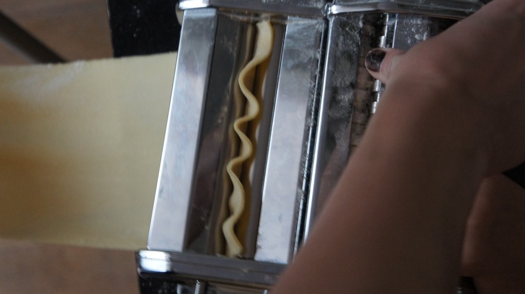 Dit is echt een favoriet gerecht om te koken en te eten van de Missus, verse pasta. Zelfs het kneden vind ze leuk genoeg om er vieze handen voor over te hebben, en de pasta door de molen draaien is helemaal haar ding. We houden vaak een stukje deeg apart waarmee ze zelf lekker gaat rommelen: spaghetti maken, uitsnijden met de raviolimaker, poppetjes van kneden en daar vadertje en moedertje mee spelen, the usual. Bij het draaien van de pasta raken we altijd in de knel. De molen zet je in principe vast aan het aanrecht of de tafel, maar bij ons wil dat niet lukken dus moeten we hem zelf op zijn plek houden. Daar komt nog bij dat de Missus linkshandig is en daardoor vaak de hendel de verkeerde kant opdraait, terwijl ik met één hand de pasta door de molen probeer te voeren én de molen vast te houden én de gerolde pasta weer op te vangen… Zie je het een beetje voor je? Begin hier dan ook niet aan in tijden van stress, pms of ander ongeluk, het vergt het uiterste van je ouderlijk geduld…