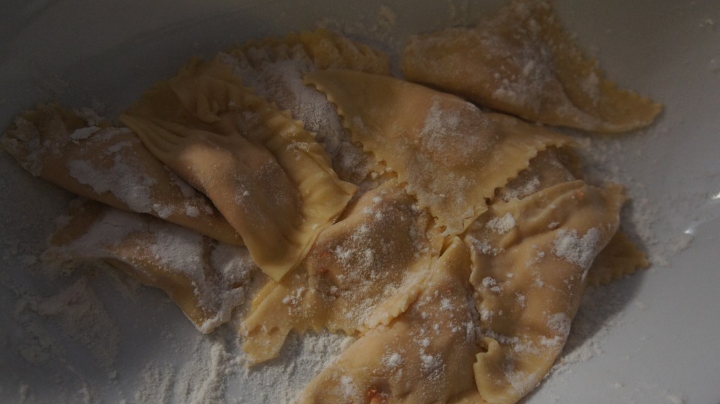 Rol daarna de pasta en leg een deeglap op tafel. Schep er hompjes vulling op, ter grootte van een eierlepeltje ongeveer. Maak daarna een raster tussen de vulling met een natte vinger en leg een tweede deeglap erop. Druk het deeg aan op de plekken waar je de onderste lap vochtig hebt gemaakt en rol daarna een ravioli-mesje er overheen. Bestrooi nogmaals met bloem voor je ze opstapelt en kook ze daarna in 1 á 2 minuten gaar in een grote pan gezouten water.