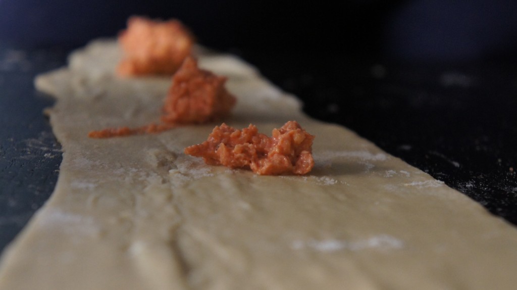 Voor ravioli moet je natuurlijk meer moeite doen. Maak de vulling terwijl het deeg in de koelkast rust: maal eerst de amandelen redelijk fijn in de keukenmachine, een soort griesmeelgrof zeg maar. Voeg daarna de zongedroogde tomaten en de ricotta toe en maal een paar minuten tot je een mooi mengsel hebt waar nog wel wat structuur in zit. Proef een beetje en breng op smaak met z&p.
