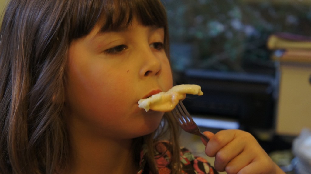 Gelukkig hadden we vandaag een helpende hand: Neef Bliksem kwam meekoken én opeten. We hadden ravioli met kindvriendelijke vulling én ‘spagzetti’ met tomatensaus met spek en erwtjes gemaakt, en het ging schoon op.
