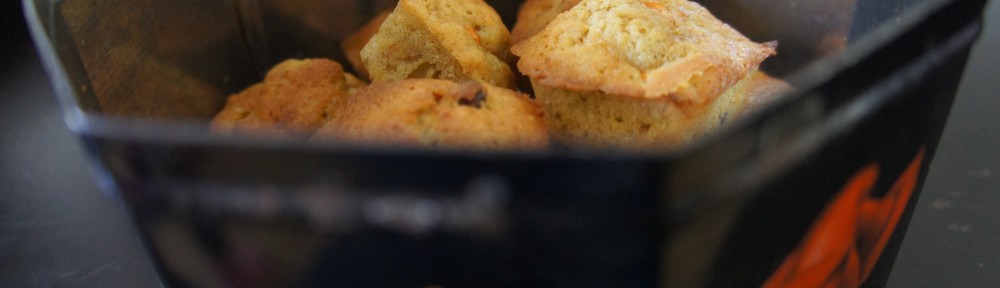 Verwarm de oven voor op 180 C. Smelt de boter in de steelpan en laat weer afkoelen. Klop de eieren en suiker in een minuut of 5 tot een dikke, bijna witte crème. Zeef in een andere mengkom de bloem, zout, bakpoeder, baking soda en specerijen. Schil of schraap de wortel en rasp hem zo fijn als je lekker lijkt, ik heb grof gedaan om de structuur te kunnen onderscheiden maar smaken verschillen. Hak de rozijnen eventueel fijn. Je kan ze ook vervangen door walnoten. Of én walnoten én rozijnen gebruiken. Meng de wortel, sinaasappelrasp en rozijnen door het bloem en roer de boter en het sap erdoor. Niet overdreven lang roeren, maar dat het net goed gemengd is. Spatel nu in 3 keer het bloemmengsel door de eiercrème. Zorg dat alles van de bodem is geschraapt. Vet de bakvorm in met de overgebleven gesmolten boter uit het pannetje en doe een halve eetlepel in ieder vormpje. Ze moeten ongeveer 2/3 gevuld zijn. Bak in het midden van de oven in 15 minuten gaar. Laat 5 minuten afkoelen en haal daarna uit de vorm. Wil je ze meenemen, zorg dat ze helemaal zijn afgekoeld voor je ze in een trommeltje doet. Anders krijg je stoomvorming en wordt de korst slap.